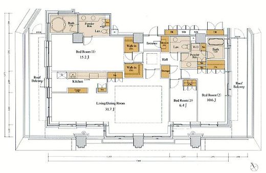 162.76㎡のゆとりある3LDKは、邸宅の風格を備えた贅沢な住空間が魅力です。31.7帖の広々としたリビング・ダイニングは、二面に開口部を設けた明るく開放的な設計で、大型家具を置いてもゆとりが生まれる圧巻の広さ。