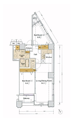 66.94㎡の2LDKは、縦に伸びるスマートなレイアウトを活かした、開放感と独立性の両立が魅力の住戸です。14.1帖のリビング・ダイニングは窓面が広く、自然光が室内をやわらかく照らす明るい空間。キッチンは独立性がありつつもリビングと程よい距離感でつながり、家事動線もスムーズです。