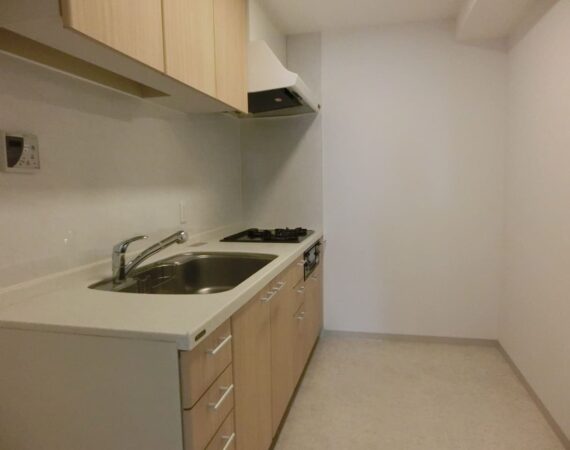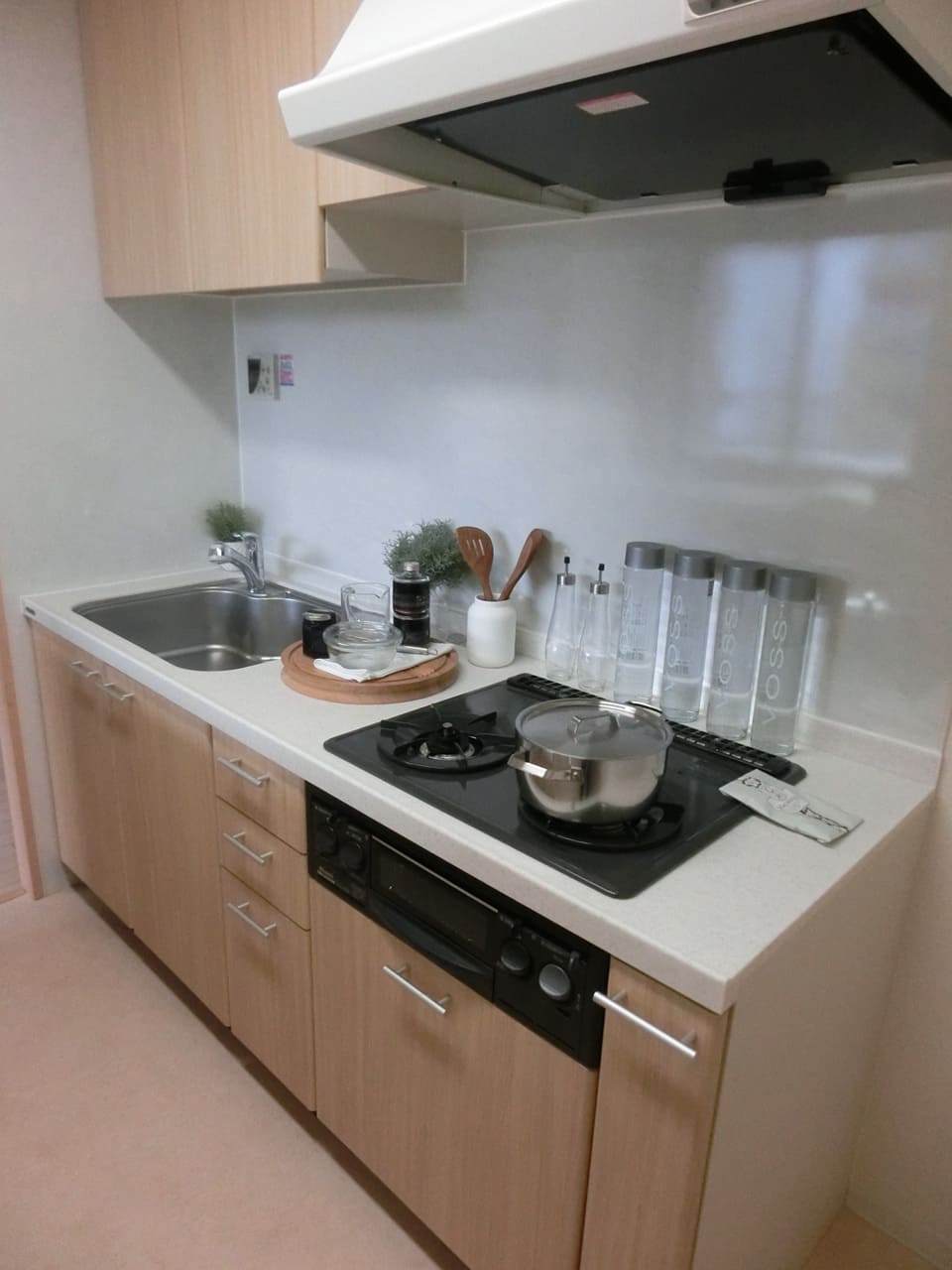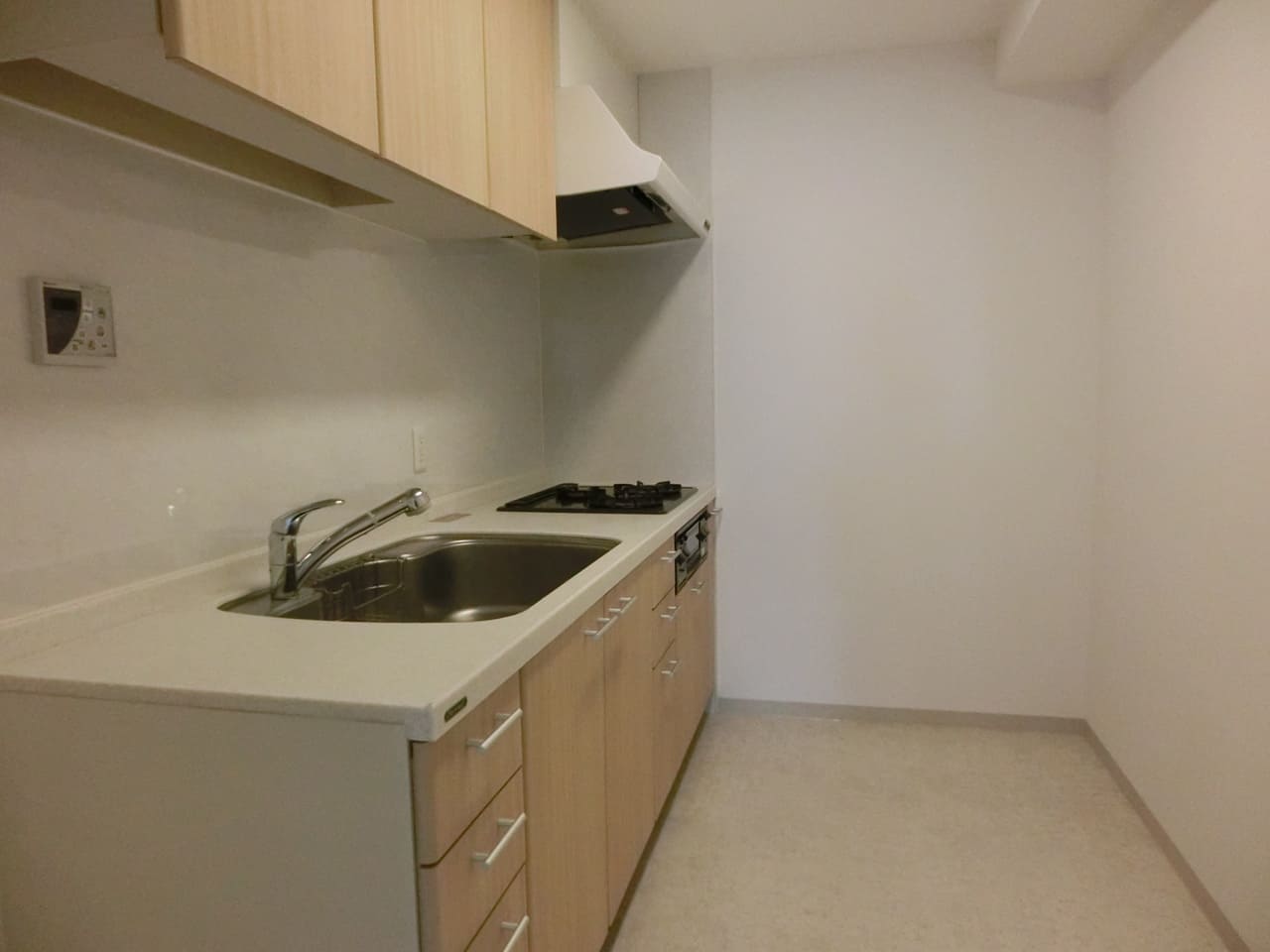 キッチンは明るい木目調の扉と白いカウンターが調和した清潔感あるデザイン。