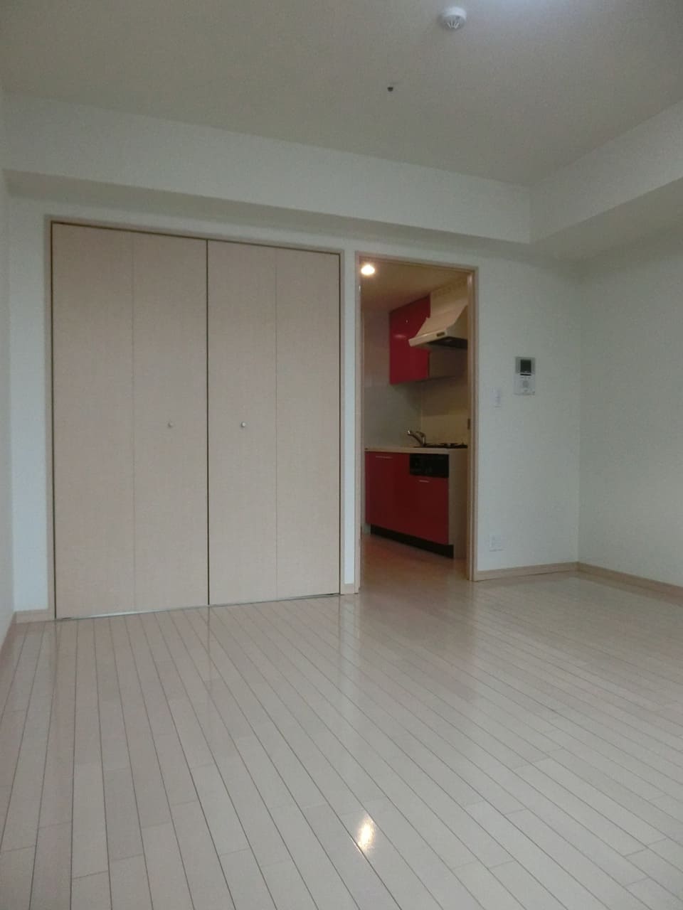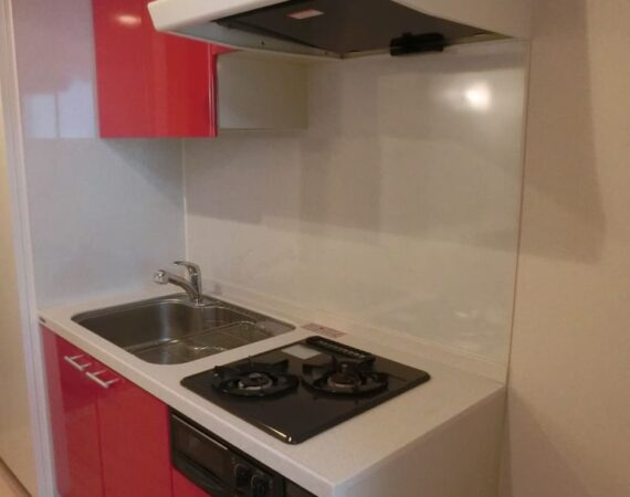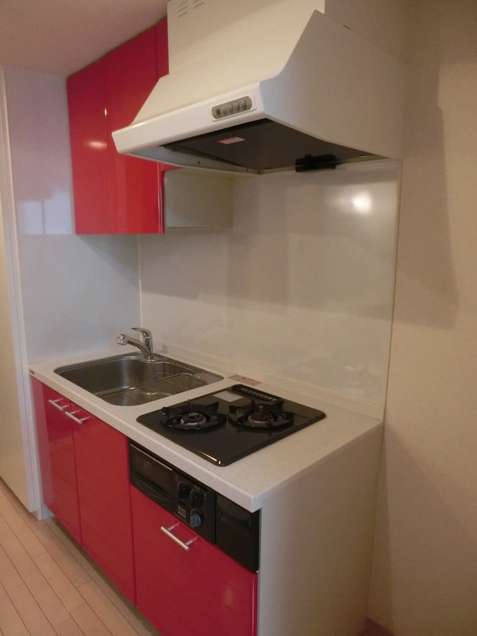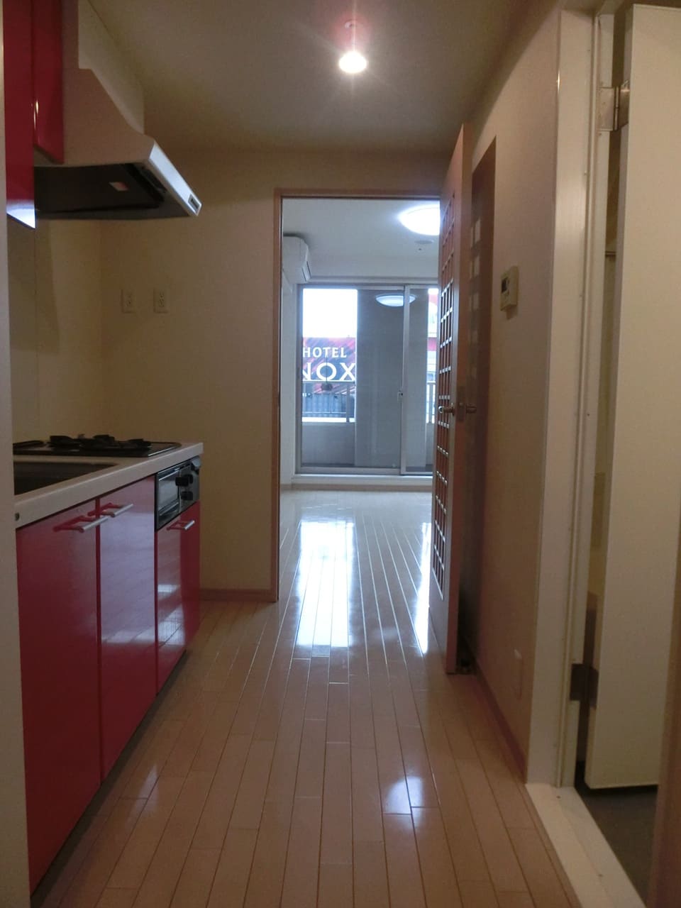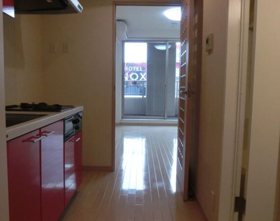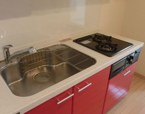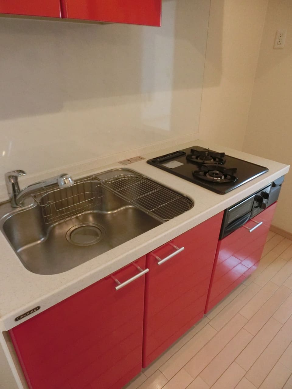 約9.2帖の広々とした居室は家具の配置がしやすく、大きな窓から安定した採光が入るため開放感があります。赤をアクセントにしたキッチンは二口コンロで自炊にも対応し、水回りにはゆとりある洗面スペースと清潔感のある浴室を備えています。バルコニーも十分な広さがあり、外干しや換気にも便利。