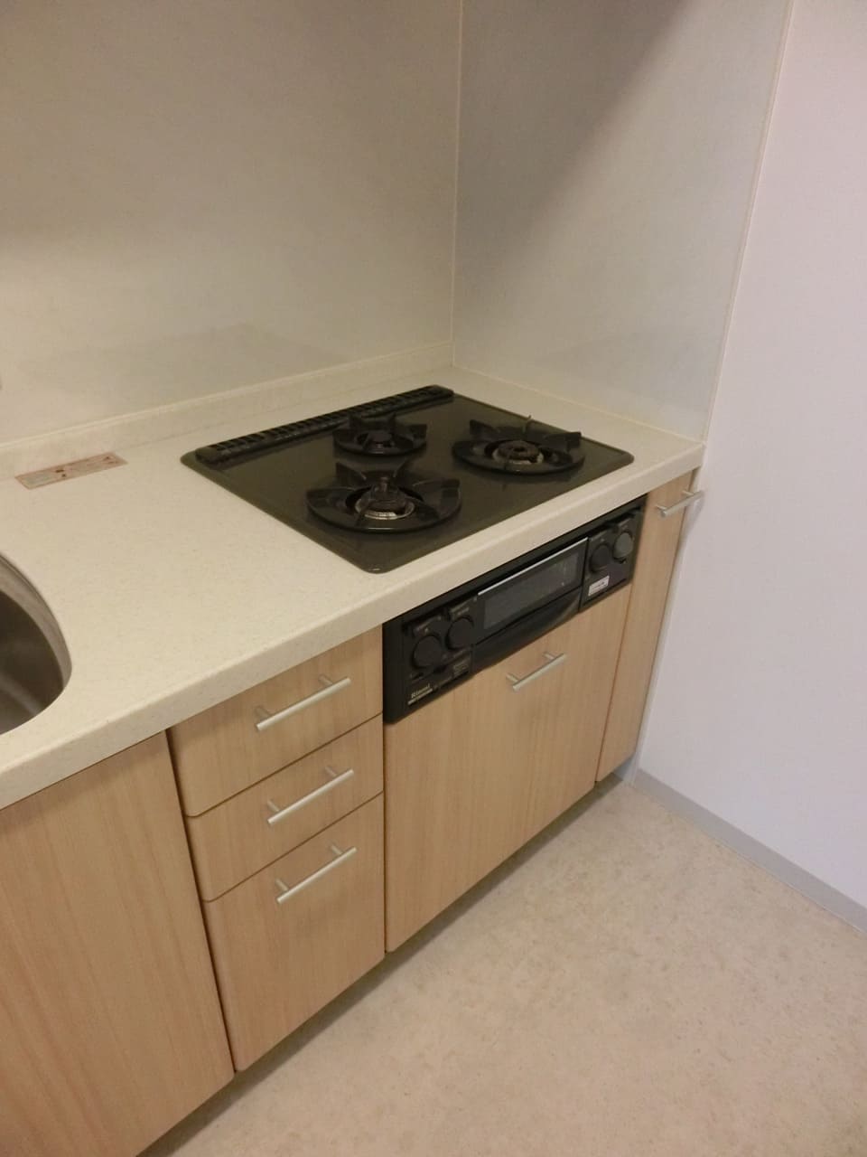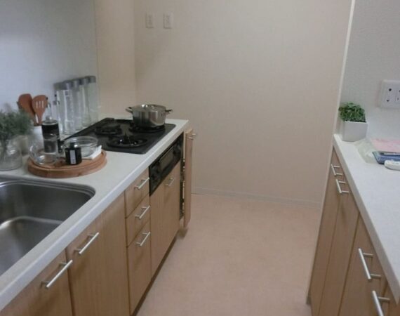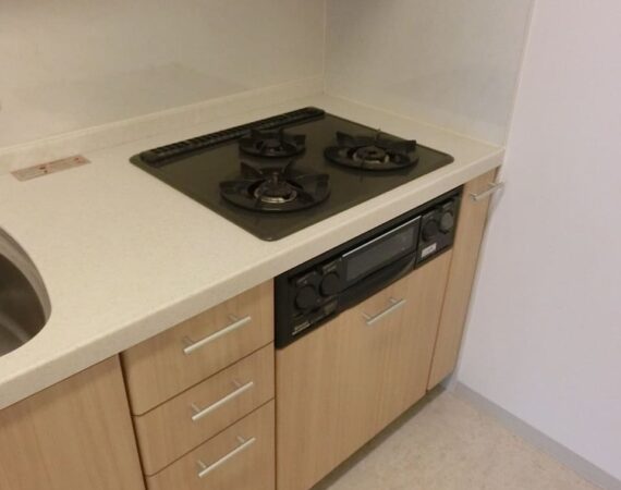 キッチンは木目調の扉とホワイトのワークトップが調和した温かみのあるデザインで、使い勝手の良い三口コンロや収納が充実。